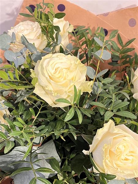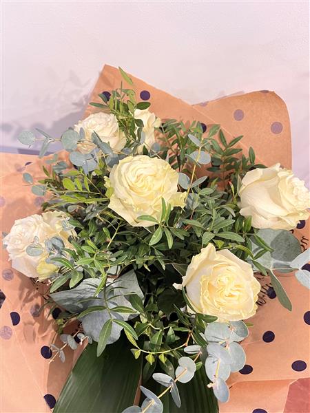 6 long stemmed white roses with a selection of foliages. Gift wrapped and in a bag